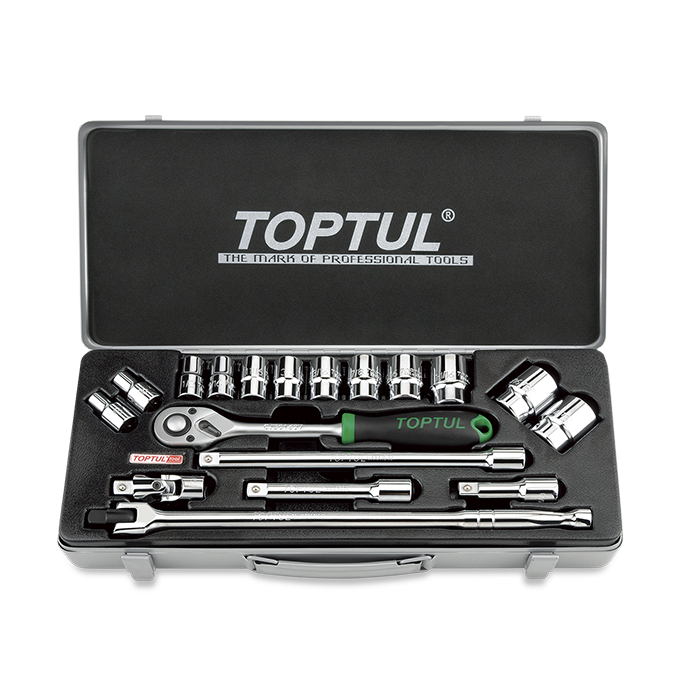 | GCAD1810 | Llave carraca 1/2”, Alargadera 1/2” 75 mm, Alargadera 1/2” 125 mm, Alargadera 1/2” 250 mm, Articulación universal 1/2”, Mango articulado 1/2" 375mm, Vasos cortos 1/2" 6C: 3/8", 7/16", 1/2", 9/16", 11/16", 3/4", 13/16", 7/8", 15/16", 1-1/16", 1-3/16, 1-1/4" |